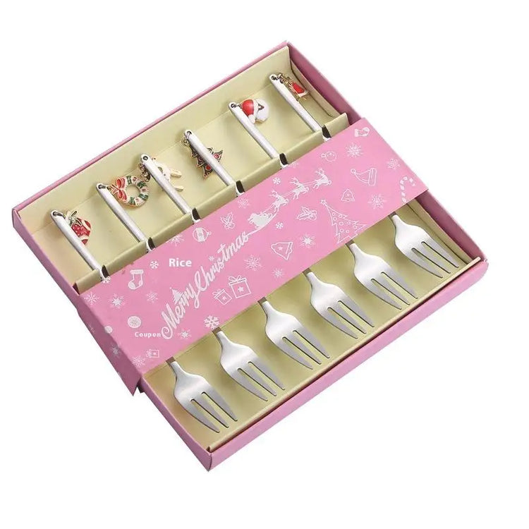 6PCS Christmas Spoons Coffee Cutlery Set Stainless Steel Cutlery Set Dessert Spoon Forks Christmas Gifts Elk Christmas Decoratio